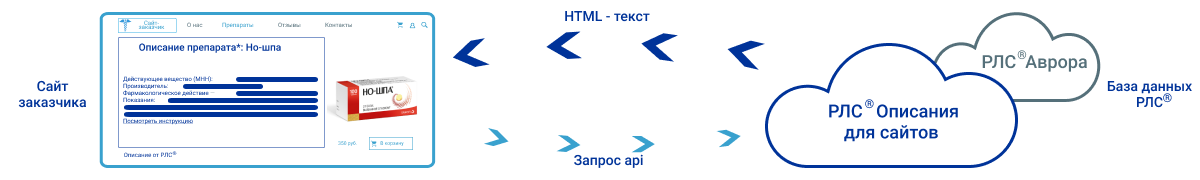 Разработчик сайта-подписчика реализует проксирование запросов своих пользователей к РЛС® Авроре и предоставляет информацию на страницах своего сайта. Но при этом он не разрабатывает собственные структуры хранения и процедуры обновления информации по описаниям ЛС. Пользователь сайта-подписчика получает информацию о лекарственных средствах и других ТАА, за актуальность и достоверность которой отвечает РЛС® Аврора. При этом он не отправляет прямых запросов к РЛС® Авроре, поэтому для него и поисковых систем сохраняется иллюзия принадлежности контента сайту-подписчику.